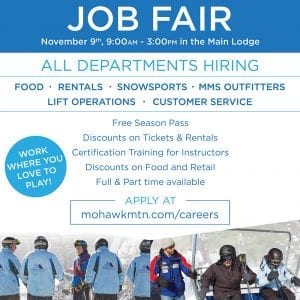 Work where you love to play! Mohawk Mountain is hiring in all departments, so come to our Job Fair, Nov 9th from 9am-3pm. Working at Mohawk Mountain comes with great perks, such as a Free Season Pass, Discounts, Certification Training for Instructors and more! Apply online at www.mohawkmtn.com/careers